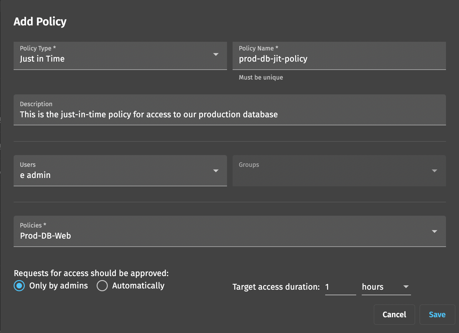 <figure><img src="https://2296692744-files.gitbook.io/~/files/v0/b/gitbook-x-prod.appspot.com/o/spaces%2FB1x0ofz14evTHlwIRKaW%2Fuploads%2F8FLXikRO2hoWIg3A4CAp%2Fspaces_oMfD0EzU2IyYSm8Bdt30_uploads_BO4VR2rRZ7yy38S6zbsK_image.webp?alt=media&#x26;token=0c89a7a1-1a63-4fca-8d62-f790b7562787" alt=""><figcaption><p>Example of a just-in-time policy in the web app</p></figcaption></figure>