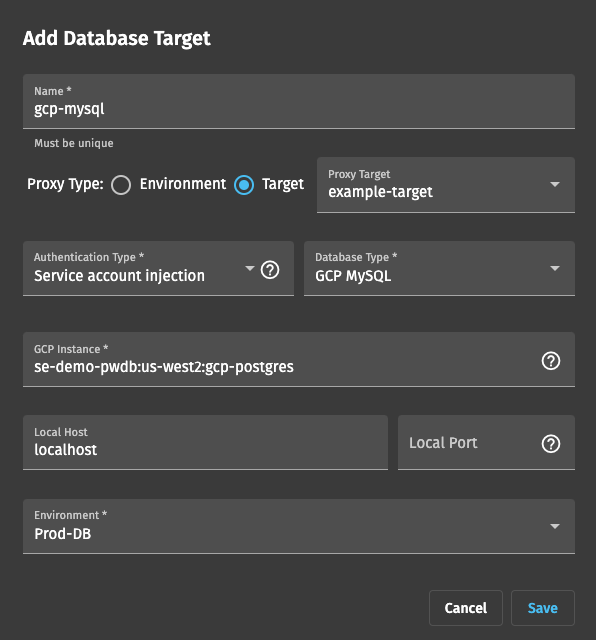 * In the "Remote Host" field, enter the instance connection name from GCP (e.g., `se-demo-pwdb:us-west2:gcp-postgres`). **Based on the authentication method and database type chosen, BastionZero will prepend the protocol prefix if it is not provided with the instance name; so you can safely omit the `gcp://`.**