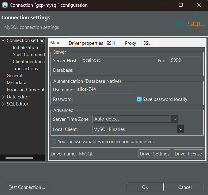 In your database client, the username is your GCP IAM service account (i.e., `alice-744`).&#x20;