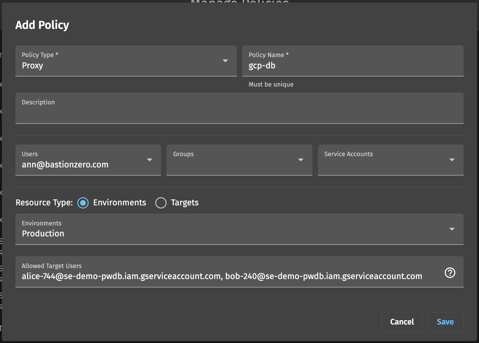 * In the “Allowed Target Users” section, add the service accounts from GCP (e.g., `alice-744@se-demo-pwdb.iam.gserviceaccount.com`, `bob-240@se-demo-pwdb.iam.gserviceaccount.com`).