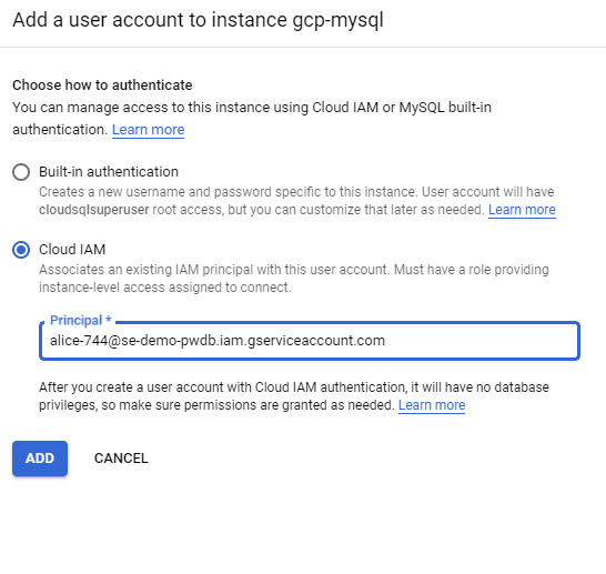 You are also able to connect using the full instance connection name if that better suits your workflow. That may look like: `zli connect alice-744@se-demo-pwdb.iam.gserviceaccount.com@gcp-mysql`.