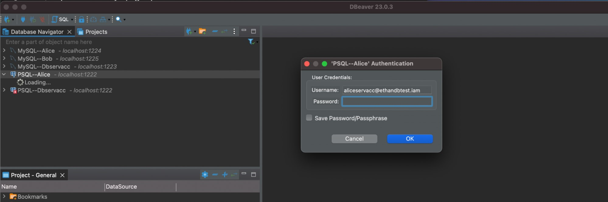 In your database client, the username is the abbreviated instance name that is comprised of all the content before `gserviceaccount.com` (i.e., `alice-744@se-demo-pwdb.iam`).