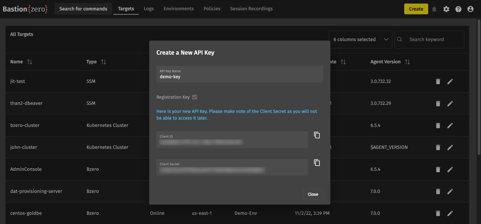 We can grab a registration key from the BastionZero web interface at [cloud.bastionzero.com](https://cloud.bastionzero.com). Once you sign in, select "Create" in the upper righthand corner and choose "API Key."&#x20;