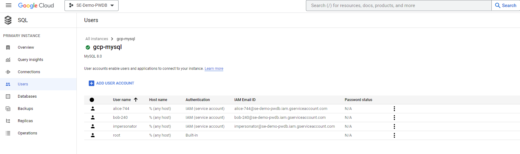 <figure><img src="https://2296692744-files.gitbook.io/~/files/v0/b/gitbook-x-prod.appspot.com/o/spaces%2FB1x0ofz14evTHlwIRKaW%2Fuploads%2FoIBd5ATqUJG1TgJTfNyv%2Fimage9.png?alt=media&#x26;token=419940bd-1321-4d03-9305-adf479a0b2e5" alt=""><figcaption><p>Your CloudSQL Database Users should look something like this after you've addd your users to the database. Note the IAM email ID; you'll need this later for policy and connection.</p></figcaption></figure>