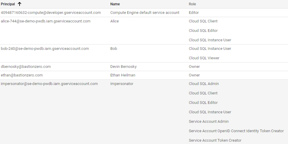 * Impersonator: "Cloud SQL Client," "Cloud SQL Editor," "Cloud SQL Instance User," "Service Account Admin," "Service Account OpenID Connect Identity Token Creator," "Service Account Token Creator"